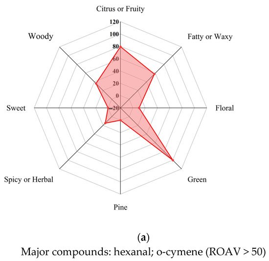 Typically, VOCs with ≥ 1 are considered KOCs, while those with 0.1 ≤ < 1 are deemed to have a significant influence on the overall odor. The VOC with the highest contribution to overall odor of the sample is defined as having ROAV = 100. Furthermore, VOCs with ROAV ≥ 1 are identified as key odor contributors in the sample. By combining the odor characteristics and values of the VOCs, the ROAVs of VOCs with similar odor characteristics were summed, and an odor radar chart was constructed to visualize the distribution of the odor profile of sample.