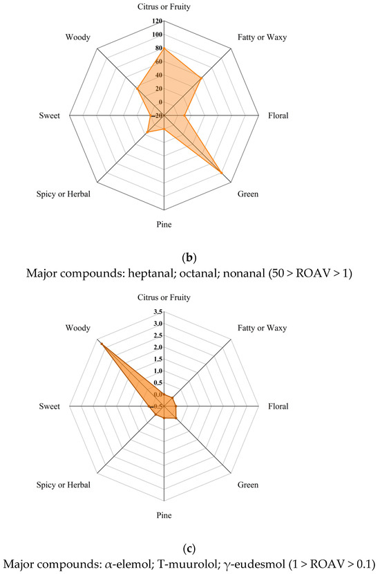 Odor radar charts based on different VOCs: (a) all VOCs; (b) VOCs with ROAV ≥ 1; (c) VOCs with 0.1 ≤ ROAV < 1.