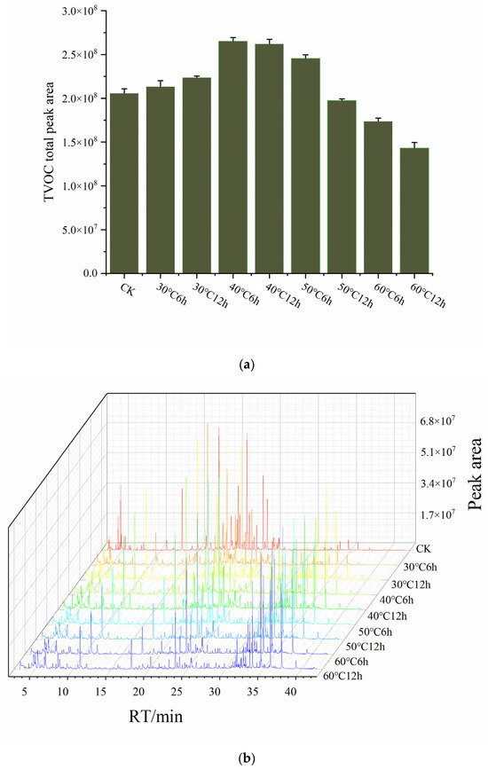 Based on the analysis of VOCs and KOCs in EPB, it was found that the compounds remaining in the board after high-temperature pressing primarily consist of MVOCs, with smaller quantities of HVOCs and LVOCs. Among the HVOCs, most are classified as KOCs, which play a critical and decisive role in defining the overall odor characteristics of the board. Considering these characteristics, it can be inferred that appropriate thermal post-treatment processes, applied without compromising the structural and mechanical properties of the board, can effectively reduce the residual HVOCs and significantly lower the MVOC content. This can substantially improve the odor profile of board, providing important support for enhancing its quality and suitability for indoor applications. To explore this optimization strategy, EPBs were subjected to thermal post-treatments at 30, 40, 50, and 60 °C for durations of 6 and 12 h. The total VOCs, KOCs, and compounds with 0.1 ≤ ROAV < 1 under different treatment conditions were subsequently analyzed, with the results presented in Figure 3 and Table S2.
