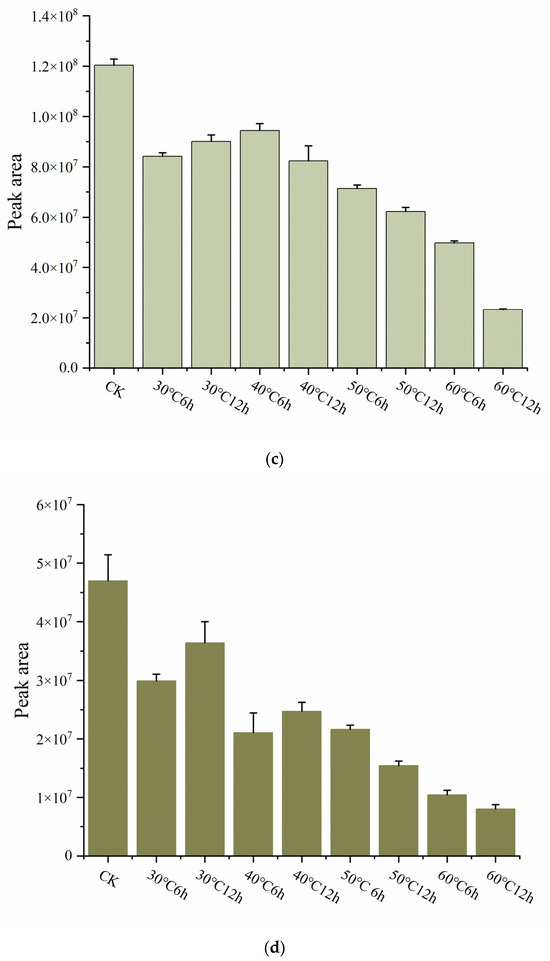 The analysis indicates that thermal post-treatments result in significant changes in the residual VOCs in EPB. As the temperature increases and the treatment duration extends, the peak area of residual VOCs initially increases and then decreases. Notably, after treatments at 30, 40, and 50 °C, the residual VOC content in the EPB is consistently higher than that in the untreated group. This suggests that even during storage, substantial amounts of VOCs continue to be released from the boards, potentially affecting the surrounding air quality. Therefore, accelerating the release of these odor-causing compounds through appropriate treatment before the boards are sold is crucial. Such measures can not only improve the olfactory characteristics of the EPB but also mitigate its impact on indoor air quality [15]. Analysis of the VOC residues in EPB under different thermal post-treatment conditions revealed that at 30 °C with a short treatment duration (6 h), only a small amount of VOCs were released, likely dominated by HVOCs. However, during the release process, some compounds may have been adsorbed or retained within the micropores of the wood structure, resulting in a slight increase in the VOC peak area compared to untreated boards. As the treatment duration was extended to 12 h, MVOCs and LVOCs began to volatilize gradually. However, due to the relatively low temperature, these compounds could not fully dissipate and instead accumulated within the surface or internal voids of the particleboard, leading to an observed increase in residual VOC content. When the temperature was raised to 40 °C and applied for 6 h, thermal energy accelerated the release of HVOCs and some MVOCs. However, certain compounds may have been adsorbed or retained within the microstructures of the wood during this process, causing the residual VOC peak area to increase. With an extended treatment time of 12 h, some volatile compounds gradually diffused to the surface of the particleboard and were released into the air, leading to a reduction in the residual VOC content. At 60 °C, with the treatment time extended, the thermal process significantly enhanced the diffusion and volatilization of VOCs within the particleboard, resulting in a continuous reduction in the overall residual VOC amount.