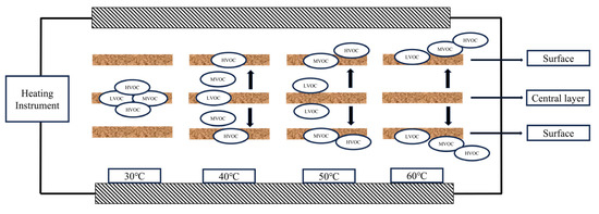 Based on the analysis of residual VOCs in Eucalyptus particleboard after post-treatment at different temperatures, we propose a process for the release of VOCs, as shown in the Figure 4.