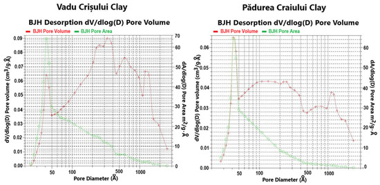 The fine microstructure proven by the POM microscopy evidences the finest fractions of kaolinite in both clays originating in Vadu Crisului and Pădurea Craiului. These are obviously sported by their specific interference color, ranging from bright white to pale blue depending on the particle’s orientation regarding the microscope’s optical axis [