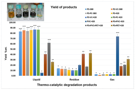 The statistical analysis of the yield variation of thermo-catalytic degradation products showed that the PS yields had significant differences from the yields of the other plastics studied (p < 0.05). The types of plastic wastes have a great influence on their obtained liquid fraction yields.