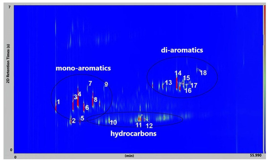 Figure 11 presents the GC × GC-qMS chromatogram of liquid oil obtained by thermal degradation of a mixture of plastic waste (PS+PVC+PET) at 420 °C. Twenty-four compounds were identified and shown in