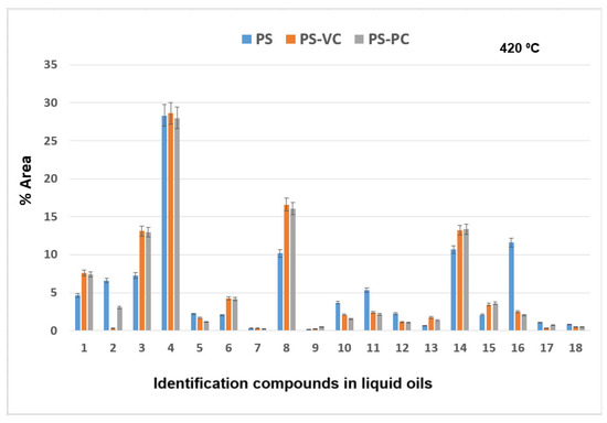 The results of GC × GC-qMS analysis of identified compounds (% Area) of the liquid oils obtained by thermal and catalytic degradation of PS waste at 420 °C are shown in