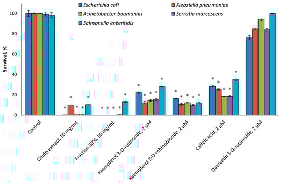We evaluated in vitro the antimicrobial activity of the crude extract at the concentration of 50 mg/mL in PBS, its fractions at the concentration of 50 mg/mL in PBS, and the identified compounds at a concentration of 2 µM. PBS served as a negative control. In the experiment with the biofilm-producing bacterium, streptomycin served as a positive control. Still, it was not able to kill the drug-resistant Escherichia coli, Klebsiella pneumoniae, Acinetobacter baumannii, Serratia marcescens, and Salmonella enteritidis bacteria (Figure 1).