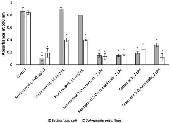 Figure 2 shows that the effect of the crude extract and the active fraction was not significant on biofilm formation in the case of E. coli. Still, the identified flavonoids had substantial inhibitory activity (p < 0.001). In the case of S. enteritidis, all tested plant material was significantly (p < 0.001) effective. Moreover, kaempferol 3-O-robinobioside and quercetin 3-O-rutinoside acted better than streptomycin.