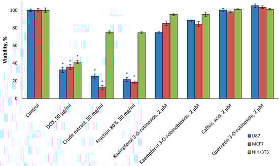 Effect on cancer cell line proliferation of F. benjamina extract, active fraction, and flavonoid phytochemicals. The concentrations of the crude extract and the fraction were 50 mg/mL; DOX was at a concentration of 50 µg/mL; the flavonoids were applied at a concentration of 2 µM. NIH/3T3 (noncancerous cells) and MCF7 and U87 (cancer cell lines) were used. Three independent experiments were performed. Asterisks indicate p < 0.001 as compared to the respective controls.