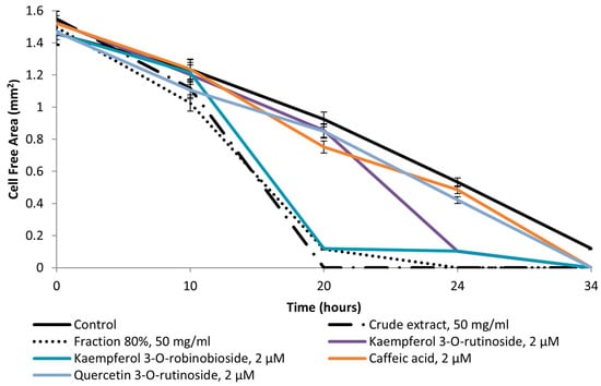 With regard to its pro-WH properties, Figure 4 demonstrates that the best pro-WH properties belonged to the crude extract which enhanced WH significantly (p < 0.001) as complete WH was observed in 20 h. Only the 80% fraction was effective (p < 0.001), but it acted slightly less than the extract (Figure 4). Kaempferol 3-O-robinobioside, a flavonoid component of the active fraction, enhanced WH significantly 20 h after the treatment (p < 0.001) but slightly less than the extract and the active fraction. Before these experiments, the extract’s cytotoxicity and its components were determined. The extract was not toxic for HDF cells at a concentration of less than 1000 µg/mL, for the active fraction at a concentration less than 1400 µg/mL, and for all tested compounds at a concentration of 100 µg/mL at least (the results are not presented).