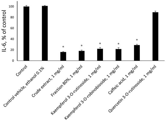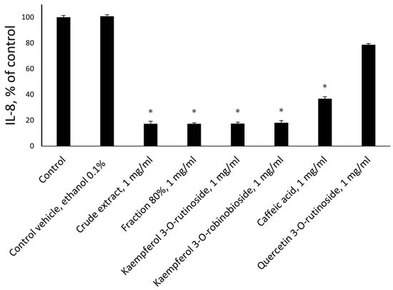 Further experiments investigated the expression of pro-inflammatory cytokines IL-6 (Figure 5) and IL-8 (Figure 6) from the HDFs. We found that their secretion was significantly reduced after treatment by crude extract, the 80% fraction, caffeic acid, kaempferol 3-O-rutinoside, and kaempferol 3-O-robinobioside (p < 0.001).