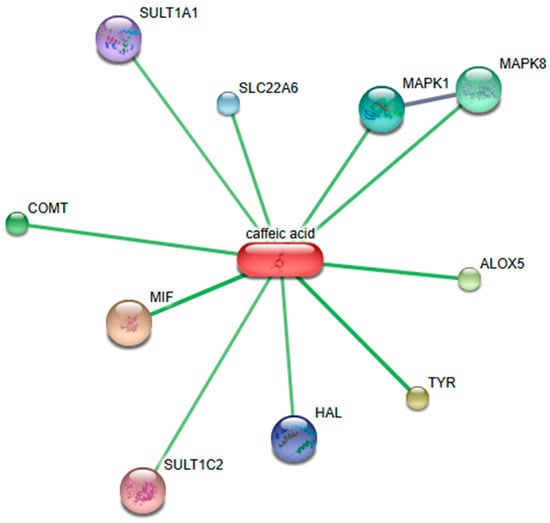Protein–protein and protein–compound interactions between human targets of caffeic acid. This figure was constructed using the default settings of the STITCH database (http://stitch.embl.de/, accessed on 4 April 2024).