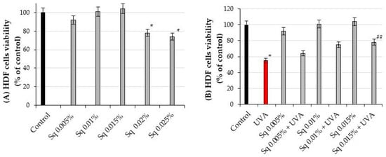 As shown in Figure 3B, the viability of HDFs in this experiment was found at 64%, 75%, and 78% of the values found in the cells exposed only to UVA radiation, respectively. These differences were statistically significant (p < 0.05). Figure 3B and Table S1 show that Sq mitigates the UVA-induced reduction in HDF viability in a concentration-dependent manner, with the most protective effect at a concentration of 0.015%.