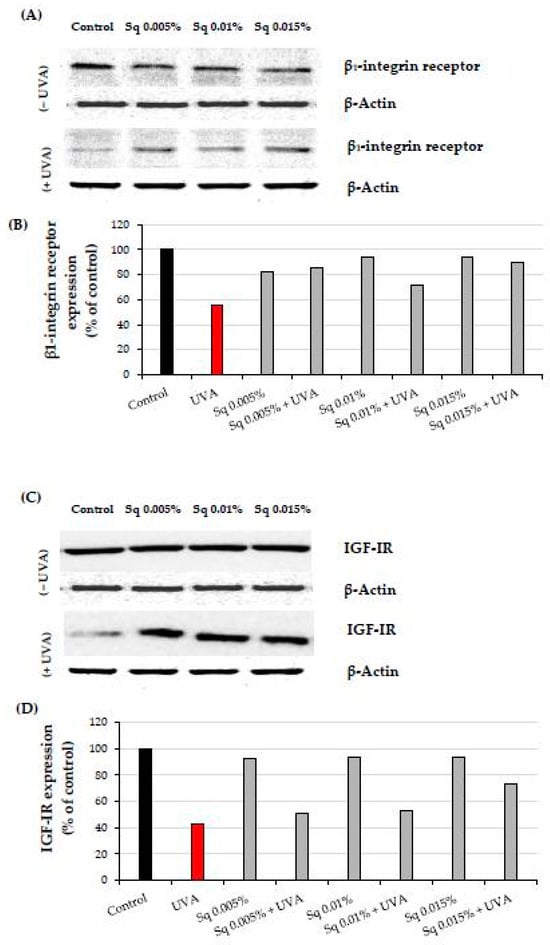 (A) Western blot and (B) densitometry (completed using ImageJ® 1.8.0) for β1-integrin receptor expression with actin as a loading control, and (C) Western blot and (D) densitometry for IGF-IR expression with actin as a loading control in HDF irradiated with UVA and treated with squalane (Sq) at concentrations of 0.005%, 0.01%, and 0.015%. The results are compared to the control (PBS-treated cells without exposure to UVA or squalane). Data were obtained from 3 pooled homogenates.