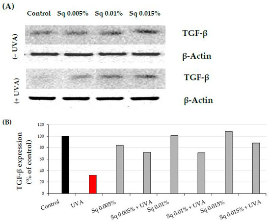 The following supporting information can be downloaded at https://www.mdpi.com/article/10.3390/molecules30091964/s1: Table S1. The MTT test for HDF viability (A) treated with Sq at concentrations of 0.005%, 0.01%, 0.015%, 0.02%, and 0.025% vs. the control (B) irradiated with UVA and treated with Sq at concentrations of 0.005%, 0.01%, and 0.015% vs. the control. The mean values. standard deviation (SD), standard error (SEM), and median (Me) from the 3 experiments. * Statistically significant differences at p < 0.05 compared to the control. ## Statistically significant differences at p < 0.05 compared to the UVA group. Table S2. Collagen biosynthesis measurements in HDF irradiated with UVA and treated with Sq at concentrations of 0.005%, 0.01%, and 0.015%. (1st: first measurement in sample. 2nd: second measurement in sample. Δ—difference between the 1st and 2nd measurements in the sample. * Statistically significant differences at p < 0.05 compared to the control. Table S3. Prolidase activity in HDF irradiated with UVA and treated with Sq at concentrations of 0.005%, 0.01%, and 0.015%. The mean values from the experiments performed in triplicate. * Statistically significant differences at p < 0.05 compared to the control. ## Statistically significant difference at p < 0.05 compared to UVA. Figure S1. Western blot densitometry (plot measurement) results by gel analysis tool for Fiji ImageJ® 2.16.0 for (A) β1-integrin (B) and IGF-IR receptors expression in UVA-irradiated HDFs in the presence of Sq at concentrations of 0.005%, 0.01%, and 0.015%. Figure S2 Western blot densitometry (plot measurement) results by the gel analysis tool for ImageJ® 1.8.0 for (A) TGF-β1 and (B) p38 protein expression in UVA-irradiated HDF in the presence of Sq at concentrations of 0.005%, 0.01%, and 0.015%. Figure S3 Western blot densitometry (plot measurement) results by the gel analysis tool for ImageJ® 1.8.0 for COX-2 protein expression in UVA-irradiated HDF in the presence of Sq at concentrations of 0.005%, 0.01%, and 0.015%.