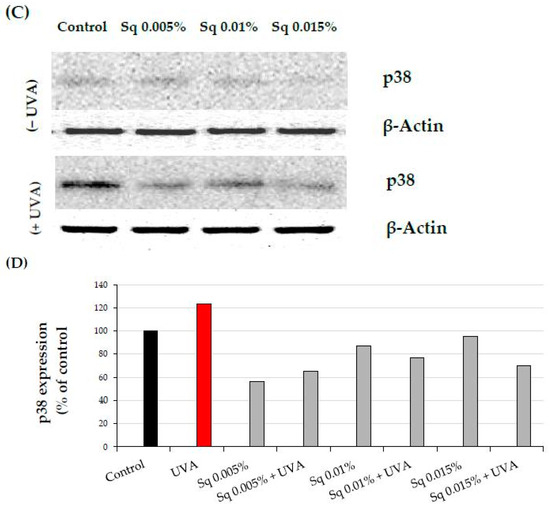 (A) Western blot and (B) densitometry (completed using ImageJ® 1.8.0) for TGF-β1 expression with actin as a loading control, and (C) Western blot and (D) densitometry for p38 protein expression with actin as a loading control in HDF irradiated with UVA and treated with squalane (Sq) at concentrations of 0.005%, 0.01%, and 0.015%. The results are compared to the control (PBS-treated cells without exposure to UVA or squalane). Data were obtained from 3 pooled homogenates.