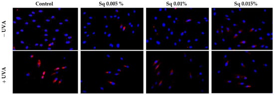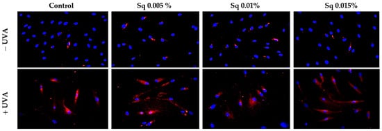 Expression of Nrf2 (visualized using immunofluorescence staining) in HDF irradiated with UVA and treated with squalane (Sq) at concentrations of 0.005%, 0.01%, and 0.015%. The results are compared to the control (PBS-treated cells without exposure to UVA or squalane). Blue staining indicates the nuclei, and red staining represents Nrf2 expression. Images were obtained at 20× magnification. Note: The antibody used detects the total Nrf2, not its phosphorylated form.