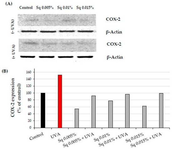 (A) Western blot and (B) densitometry (completed using ImageJ® 1.8.0) for COX-2 expression with actin as a loading control in HDF irradiated with UVA and treated with squalane (Sq) at concentrations of 0.005%, 0.01%, and 0.015%. The results are compared to the control (PBS-treated cells without exposure to UVA or squalane). Data were obtained from 3 pooled homogenates.