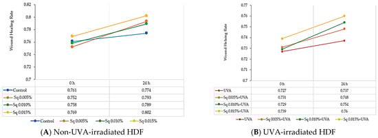 Wound healing rate in HDF treated with squalane (Sq) at concentrations of 0.005%, 0.01%, and 0.015%. (A) Non-UVA-irradiated HDF after 24 h of treatment. (B) UVA-irradiated HDFs after 24 h of treatment. The results are compared to the control (PBS-treated cells without exposure to UVA or squalane). The wound closure rate was quantified and analyzed using ImageJ® 1.8.0 software with the Wound Healing Size Tool extension.