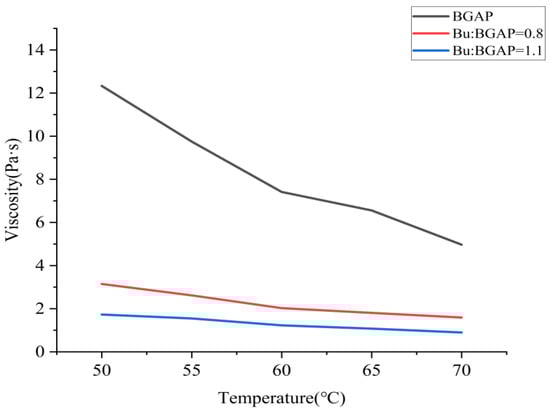 25]. After adding plasticizers, the solution flows more easily. According to the flow equation, it can be inferred from the viscosity coefficient K and non-Newtonian index n that the Apparent viscosity of BGAP is greatly affected by temperature, and the K value decreases significantly with increasing temperature. When Bu is added as a plasticizer, and the plasticization ratio is 1.1, the K value remains unchanged after the temperature exceeds 55 °C. Adding a plasticizer can improve the rheological properties of the adhesive, while the Apparent viscosity is more affected by temperature. According to the “lubrication theory”, plasticizers reduce the “friction” between polymers, so when the temperature increases and the molecular chain moves more vigorously, the “obstacles” to the free movement of the molecular chain are smaller.