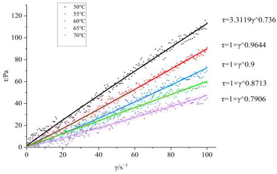 When the curing temperature is 50 °C, it was found that the rheological equation of the adhesive still conforms to the power-law equation (as shown in