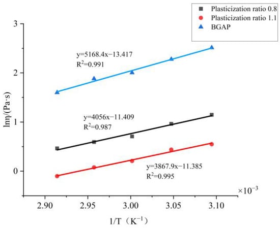 Figure 3, it can be seen that BGAP belongs to a pseudoplastic fluid before and after adding plasticizers. The relationship between apparent viscosity, shear rate, and temperature can be described using power-law equations (Equation (1)) and Arrhenius equations (Equation (2)) [