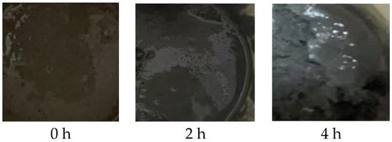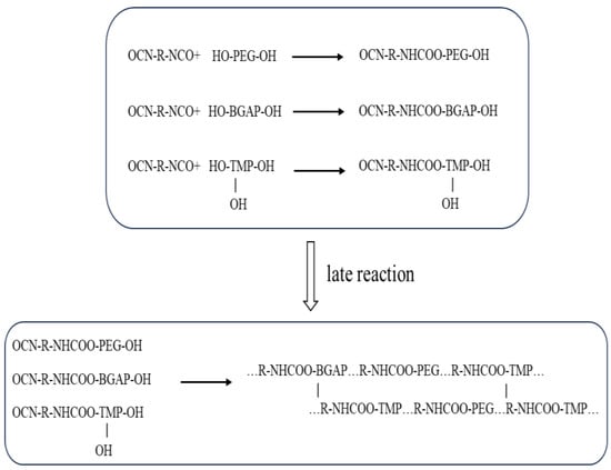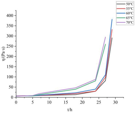 Figure 6) changes slowly in the early stage and even decreases with the progress of the curing reaction in the first 2 h. However, when the curing time exceeds a certain threshold, the apparent viscosity of the adhesive begins to rise sharply. This is because the reaction between hydroxyl -OH and isocyanate -NCO is a polyaddition reaction (as shown in