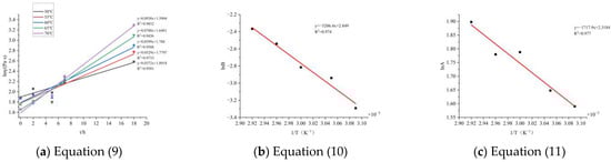 In Equations (5) and (6), η∞ is the lowest apparent viscosity of the slurry when the curing degree is zero, and the temperature tends to infinity; Eη is the viscous flow activation energy of the solidification system; k∞ is the pre-exponential factor; Ek is the activation energy of the curing reaction; R is the gas constant; T is the testing temperature.