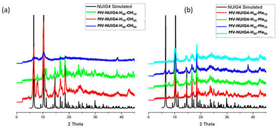 (a) PXRD patterns of MV-NUIG4-H₉₀-OH₁₀, MV-NUIG4-H₇₅-OH₂₅, and MV-NUIG4-H₅₀-OH₅₀ compared to the simulated NUIG4; (b) PXRD patterns of MV-NUIG4-H₉₀-Me₁₀, MV-NUIG4-H₇₅-Me₂₅, MV-NUIG4-H₂₅-Me₇₅, and MV-NUIG4-H₅₀-Me₅₀ compared to the simulated NUIG4.