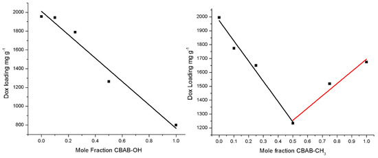 Plots showing the correlation between Dox loading and functional group composition in MV-NUIG4 frameworks (MV-NUIG4-Hx-OHy, (left); MV-NUIG4-Hx-Mez, (right)).