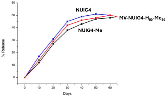 Drug release studies were conducted in both PBS solution (pH 7.4) and acetate buffer solution (pH 5.5), as shown in Figure 7. These frameworks exhibit a release behaviour akin to NUIG4, showcasing a slow release over a span of 10–20 days in water, and an accelerated release under acidic conditions. The quantity of Dox released in the MV-NUIG4-Hx-OHy family decreases as the CBAB-OH mole fraction increases. This is related to the increased water stability of the MOFs due to hydroxylation ortho to aromatic imines. Indeed, hydroxylation ortho to aromatic imines has been utilized for enhancing water stability in both MOFs and COFs [68,69,70]. 1,2-Hydroxyl imines can undergo oxidative cyclisation, forming a benzoxazole group, which remains stable in water and across a wide pH spectrum. It was possible to modulate the release from 49% to 32% after 40 days by increasing the CBAB-OH mole fraction.