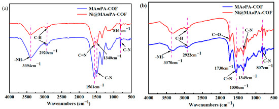 FT-IR spectra of (a) MAmPA-COF and Ni@MAmPA-COF, (b) MAoPA-COF and Ni@MAoPA-COF.