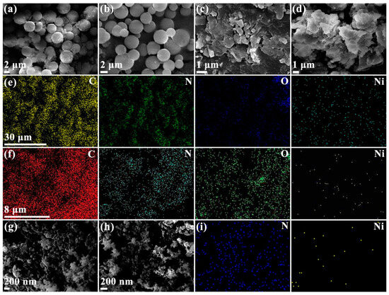 SEM images of MAmPA-COF (a), Ni@MAmPA-COF (b), MAoPA-COF (c), Ni@MAoPA-COF (d), MAPA-COF (g) [24], Ni@MAPA-COF (h) [24] and energy-dispersive X-ray spectroscopy (EDX) of Ni@MAmPA-COF (e), Ni@MAoPA-COF (f) and Ni@MAPA-COF (i) [24].