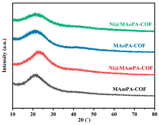 The MAPA-COF synthesized with melamine and p-phthalaldehyde as building blocks in a DMSO solvent in our previous study had low crystallinity [24]. In order to confirm the crystallinity of MAmPA-COF and MAoPA-COF with DMSO and 1,4-dioxane as solvents in this work, they were tested using XRD. The X-ray diffractograms of MAmPA-COF and MAoPA-COF and the two nickel catalysts all exhibited distinct broad tympanic peaks around 2θ = 22° and had low crystallinity (Figure 4). The XRD pattern shows that the molecules of these COFs based on the Schiff-base reaction have amorphous arrangement [26]. However, Ni@MAPA-COF had better crystallinity [24]. The difference in crystallinity was because the MAPA-COF molecule has a symmetry-containing linear building monomer (terephthalaldehyde), which facilitates the formation of irregular aggregates with a submicron-sized sheet layer. This caused π-π stacking in the internal layers. Moreover, the high coordination capacity of MAPA-COF leads to increased ordering of Ni@MAPA-COF. The XRD results further indicate that the substituent position of the sub-construction unit had a certain effect on the coordination mode and the crystallinity, which was observed in the SEM and EDX results.