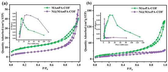 N2 adsorption and desorption isotherms and pore size distribution for MAmPA-COF, Ni@MAmPA-COF (a) and MAoPA-COF, Ni@MAoPA-COF (b).