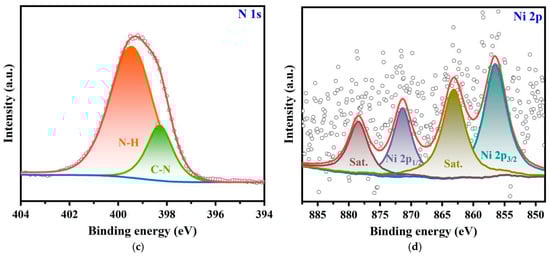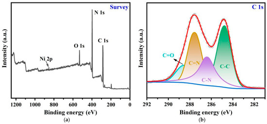 The surface composition and the bond valence of Ni@MAmPA-COF were investigated by XPS spectroscopy, and the results are shown in Figure 6. The C 1s (287.3 eV), N 1s (399.1 eV), O 1s (533.4 eV) and Ni 2p (855.0 eV) compositions could be observed from the wide XPS scanning spectrum of Ni@MAmPA-COF. The characteristic peaks of C1s in the high-resolution XPS spectra were designated as C-C (284.6 eV), C-N (285.7 eV), C=N (287.3 eV) and C=O (288.2 eV). The peaks with binding energies of 398.8 eV and 400.0 eV were attributed to N=C and N-H, respectively. The low peak intensity of Ni 2p was identified in the wide XPS scanning spectrum of Ni@MAmPA-COF. To reveal the chemical state of nickel in the complex, the high-resolution Ni 2p XPS spectrum of Ni@MAmPA was analyzed, as shown in Figure 6. The Ni 2p spectra displayed two peaks at 856.5 eV and 871.5 eV, corresponding to Ni 2p3/2 and Ni 2p1/2, respectively. And the spectrum of Ni 2p showed that there were two distinct satellite peaks at 861.53 eV and 879.52 eV [29]. The low content of Ni2+ ions might be caused by the weaker coordination effect of N atoms with (DME)NiCl2. Due to the six-membered triazine pyridine ring synthesized with MPA as a sub-constituent unit being too large, the Ni2+ ions coordinated to a small fraction of N atoms, forming a weak complex, which results in a low peak intensity of Ni2p [23]. It could be seen from the ICP results that the nickel content of Ni@MAmPA-COF is 5.76%, and low metal content was difficult to detect using a photoelectron spectrometer.