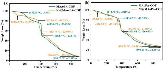 TGA curves of MAmPA-COF, Ni@MAmPA-COF (a) and MAoPA-COF, Ni@MAoPA-COF (b).