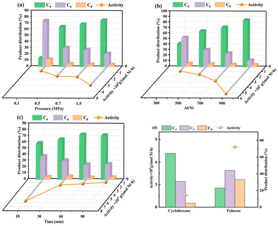 Ethylene pressure plays an important role in ethylene oligomerization, because the elevated pressure contributes to the high solubility of ethylene in the solvent. More ethylene was available for active sites to improve the catalytic activity [33]. The catalytic activity of Ni@MAmPA-COF reached a maximum value of 3.0 × 104 g/(mol Ni·h) at 1.5 MPa (Figure 8a). Interestingly, the catalytic activity of Ni@MAmPA-COF increased from 1.6 × 104 g/(mol Ni·h) to 1.7 × 104 g/(mol Ni·h) when the ethylene pressure increased from 0.5 MPa to 0.7 MPa. The results indicated that the pressure had little effect on the catalytic activity of Ni@MAmPA-COF. Increased reaction pressure was due to an increase in the selectivity of butane in oligomers, as demonstrated by the increase in the amount of C4 from 54.67% to 75.32% (Figure 8a). This was because the high pressure contributed more to β-H elimination than the chain propagation in the oligomerization process, and the selectivity (30.72%) to C6 maximized at 0.5 MPa. Comprehensively considering the influence of ethylene pressure on catalytic activity and selectivity toward C4 and C6, the ethylene pressure of 0.5 MPa was determined as the optimum value for further reaction. The catalytic activity of Ni@MAmPA-COF reached the optimum activity of 5.2 × 104 g/(mol Ni·h) at the Al/Ni ratio of 900, which suggests that ethylene oligomerization reaction demands sufficient MAO to activate more active sites (Figure 8b). Variation in Al/Ni was also found to affect the product distribution of Ni@MAmPA-COF, as evidenced by an evidently higher selectivity for C4 and a relatively low selectivity for C6 (the value of Al/Ni was from 300 to 900), which implied that higher amount of MAO might contribute to the reaction of β-H elimination. Combined with the effect of the Al/Ni ratio on catalytic activity and selectivity toward C4 and C6, the optimum Al/Ni ratio for the subsequent reaction was determined to be 500.