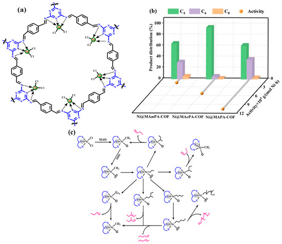 It is well known that the possible mechanism of ethylene oligomerization for the nickel(II) catalyst is as shown in Figure 9c. The active sites with empty orbitals were converted upon activation by MAO. The incorporated ethylene molecules coordinated with the active sites to form metal–alkyl groups, and chain extension occurred. At the same time, the insertion of the ethylene molecule is followed by a β-H elimination reaction, leading to the generation of short-chain oligomers and the restoration of the active site [35]. For the heterogeneous catalysts, the nature of the supports, the coordination mode and the dispersion and content of the metal active center in the supports have an important effect on their catalytic performance. In view of the above results on Ni@MAmPA-COF in ethylene oligomerization, the effect of the chemical structures of the synthesized triazine supports and the nickel content on the catalytic property was investigated under the above optimal oligomerization conditions (Figure 9a). It should be noted that the activity of the three triazine COFs is proportional to the size of their specific surface area. Ni@MAPA-COF based on MAPA-COF with a para-substituent had the highest catalytic activity of 10.55 × 104 g/(mol Ni·h) among the three nickel(II) catalysts for ethylene oligomerization (Figure 9a). This was because Ni@MAPA-COF had the highest specific surface area, pore volume (Figure 9b) and nickel content, which facilitates the access of the co-catalysts into the pores and the formation of more active centers. It also promotes the insertion of ethylene molecules and increases the rate of chain growth. Interestingly, Ni@MAmPA-COF, with the maximum pore width and higher nickel content (Table 1 and Table 2), had the lowest catalytic activity and highest selectivity of C8+ olefins in ethylene oligomerization (Figure 9a). The possible reason was that the lower specific surface area reduces the chances of contact between the active site and ethylene molecules, which leads to lower catalytic activity. The wide pore size is conducive to the chain growth of ethylene to produce more C8+ olefins. The catalyst Ni@MAoPA-COF with OPA as the guest building unit showed the best selectivity for C4, reaching 93.99% (Figure 9a). It is speculated that the effects of β-H elimination and chain transfer effect led to a various of oligomerization products (Figure 9a) [36,37]. However, due to the smallest pore width, Ni@MAoPA-COF cannot provide space conducive to the synthesis of long-chain olefins. Therefore, the ethylene molecule tends to undergo a β-H elimination reaction after growing to C4, which leads to the highest C4 yield being in the product catalyzed by Ni@MAoPA-COF. Conversely, Ni@MAPA-COF has the largest pore size, so the final products were composed of olefins with different carbon numbers due to the repeated chain extension and β-H elimination reactions, including C6 and C8.