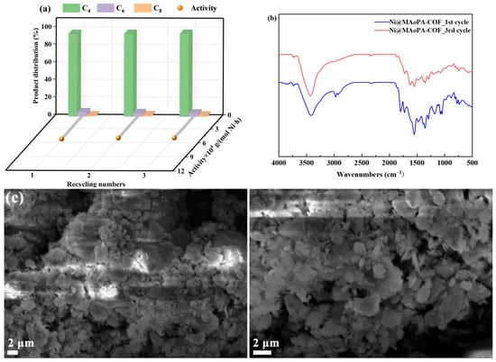 The effect of the chemical structure on the catalytic performance showed that Ni@MAoPA-COF had a higher catalytic activity than Ni@MAmPA-COF in ethylene oligomerization, and Ni@MAoPA-COF has a larger specific surface area. In order to evaluate the reusability of triazine nickel(II) catalysts, the reusability of Ni@MAoPA-COF was investigated under the optimal oligomerization parameters due to its larger specific surface area and higher activity in ethylene oligomerization. After the initial oligomerization of ethylene, the reacted catalyst was collected by centrifugation, sonication and washing, and the obtained results are shown in Figure 10a. There was no significant decrease in catalytic activity as the reaction was repeated, and the selectivity value of C4 was consistently above 90% (Figure 10a). Compared with the IR spectrum of the fresh Ni@MAoPA-COF, slight changes in the IR spectra were observed after the third cycle and the characteristic peaks of the functional groups (-CHO, C=N and C-N) weakened (Figure 10b). This was possible because of the adsorption of residual oligomers on the catalyst surface and the residue of the deactivated cocatalyst, which further indicated the good stability of the synthesized Ni@MAoPA-COF. The SEM images showed that the catalyst presented as a blocky stacking pattern after the cycling experiment, which was smaller and more tightly packed than the fresh catalyst (Figure 10c). This is considered to be caused by the adsorption of residual oligomers on the catalyst surface. The adsorbed oligomers mask the active sites on the catalyst surface, and also lead to a subtle decrease in catalytic activity.