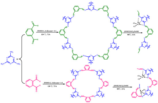 In order to improve the abovementioned phenomena and develop COFs-based catalysts with higher activity, it is crucial to modify the structure of ethylene oligomerization catalysts, especially the design of their support structure. This affects the relationship between catalyst structure and catalytic performance. Therefore, based on our previous research on the possible application of COFs in ethylene oligomerization, this work attempts to further improve the microstructure of COFs ligands with meta-phthalaldehyde (MPA) or ortho-phthalaldehyde (OPA) as sub-construction monomers in the mixed solvent to obtain COFs-based catalysts with high activity. The structure–activity relationship between the structure of the nickel(II) complexes-based triazine support materials and the catalytic behavior of ethylene oligomerization will be explored.