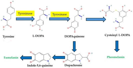 Tyrosinase is the most important enzyme engaged in the melanin formation—a catalyst of the two initial sequences in melanin biosynthesis (Figure 1). During the process of melanogenesis, the enzyme tyrosinase primarily plays a crucial role by catalyzing the conversion of L-tyrosine to 3,4-dihydroxy-L-phenylalanine (L-DOPA) through hydroxylation, which is followed by the oxidation of L-DOPA to quinone DOPA [5]. Since tyrosinase is the rate-limiting enzyme in melanogenesis, considerable research has focused on the discovery and development of inhibitors that target this enzyme for both therapeutic and cosmetic uses.