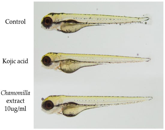 Visualization of zebrafish larvae in this study on the whitening properties of chamomile extract. The representative fish represent the negative control group, the positive control group (kojic acid), and the selected concentration of chamomile extract (10 μg/mL).