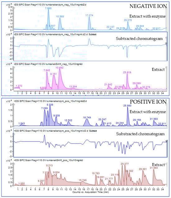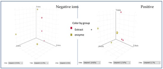 The chemometric comparative analysis of the extract injections alone and after the treatment with the enzyme showed several m/z features that were differentiating the compared samples. As presented in Figure 5 below, two separated groups were formed from the extract injections and the extract–enzyme injections during a principal component analysis. PCA was performed on three separate injections and was calculated with p < 0.05 on 715 and 802 molecular features in negative and positive ion mode, respectively.