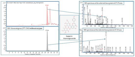 The analysis of apigenin rhamnoglucoside behavior upon the influence of tyrosinase in the recorded mass chromatograms—with and without the addition of enzyme (EIC—extracted ion chromatogram).