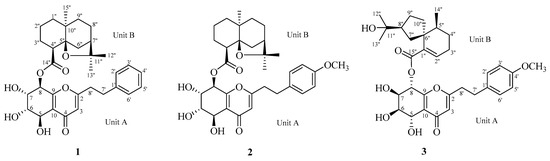 Hainan agarwood has yielded various compounds, including monosomic sesquiterpenes [4,9,10,11,12,13], flindersia-type 2-(2-phenylethyl)chromones [3,14,15,16,17,18], 5,6,7,8-tetrahydro-2-(2-phenylethyl)chromones [3,19,20,21], sesquiterpene polymers [6,22], and 2-(2-pheny- lethyl)chromone-sesquiterpene hybrids [5,8]. In the pursuit of novel structurally intriguing and bioactive compounds from Hainan agarwood, Aquisinenins G−I (1–3) were found to comprise either agarofuran or agarospirane-type sesquiterpene moieties and 5,6,7,8-tetrahydro-2-(2-phenylethyl)chromone bound via an ester bond (Figure 1). This study outlines this isolation process and includes a structural analysis and bioactivity assessment of these compounds.