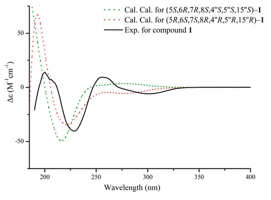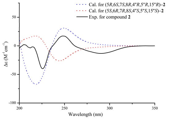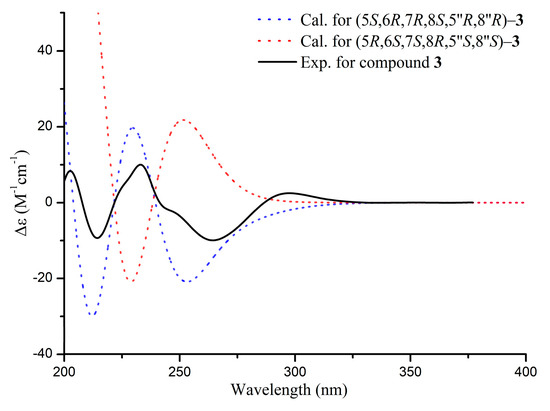 The relative configuration of unit A was determined based on ROESY data and 3JH-H coupling constants (3J6,7 = 2.6 Hz, 3J8 = 5.5 Hz), revealing H-6 and H-7 in equatorial cis-adjacent positions, while H-5 and H-8 adopt syn-facial orientations with the presence of the NOE correlation between H-5 and H-8. The NOE correlations of H-7″/H-14″ indicate that these protons are cofacial and β-oriented, establishing the relative configuration of unit B (Figure 3) as identical to that of baimuxifuranic acid [24]. The relative configuration was determined by comparing the experimental and calculated ECD spectra (Figure 6). The structure of compound 3 was identified as depicted in Figure 1 and designated as aquisinenin I.
