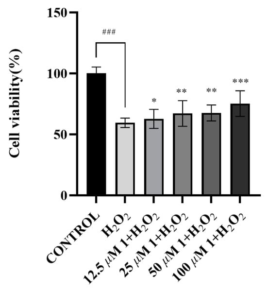 The survival rates of SH-SY5Y cells treated with compound 1. (All data of Figure 7 are expressed as mean ± (SEM), derived from three independent replicates. Statistical analyses were conducted using a one-way analysis of variance (ANOVA), with a post hoc Welch’s t-test. Significance thresholds were defined as follows: ### p < 0.001, relative to blank control group; *** p < 0.001, ** p < 0.01, * p < 0.1, versus H2O2-induced oxidative stress model group.