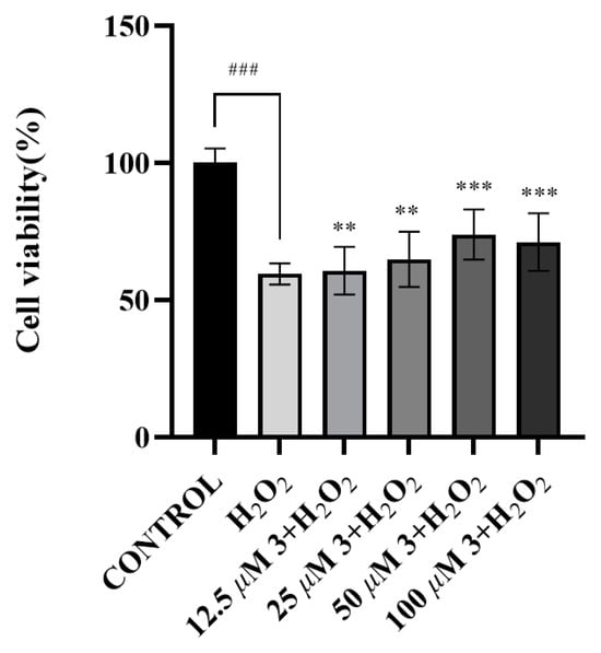 The survival rates of SH-SY5Y cells treated with compound 3. (All data of Figure 8 are expressed as mean ± (SEM), derived from three independent replicates. Statistical analyses were conducted using a one-way analysis of variance (ANOVA), with a post hoc Welch’s t-test. Significance thresholds were defined as follows: ### p < 0.001, relative to blank control group; *** p < 0.001, ** p < 0.01, versus H2O2-induced oxidative stress model group.