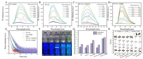 PL intensity of (A) TP-COOH, (B) TP-CF3, (C) TP-CF3-COOCH3, and (D) TP-CF3-COOH at different water contents. (E) Fluorescence lifetime of 5 solid-state AIE materials. (F) Digital images and fluorescence quantum yields of TPB, TP-COOH, TP-CF3, TP-CF3-COOCH3, and TP-CF3-COOH. (G) Fluorescence quenching efficiency of 5 AIE materials (100 μg/L) in a mixture of THF/water (1:9, v/v) and separately added fentanyl/norfentanyl (10 μg/L). (H) Energy levels of different substances calculated by B3LYP/6-31G (d, p).