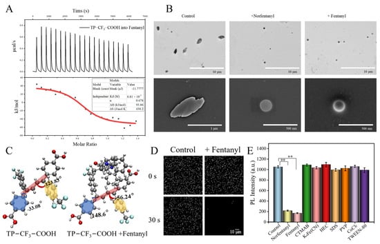 ITC of (A) TP-CF3-COOH into fentanyl. (B) TEM and SEM of TP-CF3-COOH probe, TP-CF3-COOH + norfentanyl, and TP-CF3-COOH + fentanyl. (C) The conformation of the ground state of TP-CF3-COOH and TP-CF3-COOH + fentanyl. (D) HCI of fluorescence quantum points within 30 s. Conformation of TP-CF3-COOH after binding fentanyl. (E) Fluorescence intensity of TP-CF3-COOH probe in different surfactants and quenchers (Control, Norfentanyl, Fentanyl, Cetyltrimethylammonium bromide (CTMAB), K4Fe (CN), Hydroxyethyl Cellulose (HEC), Sodium Dodecyl Sulfate (SDS), Polyvinyl Pyrrolidone (PVP), CoCl2, and TWEEN-80). ** indicates p < 0.01.